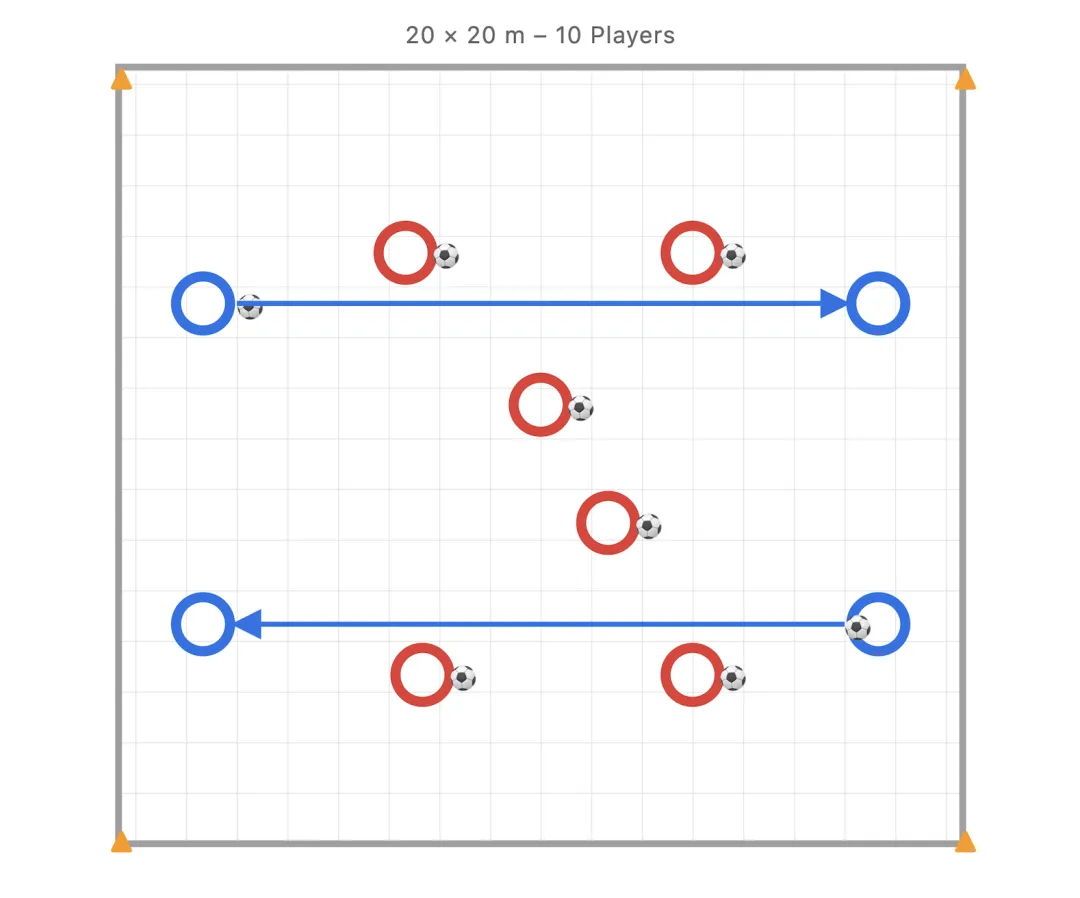 穿越陨石带。 在一个 20×20 米的区域内,4 名球员分两组站在两侧边缘互相传球,另外 6 名球员在区域内自由盘带(像移动的陨石)。传球球员需要找到安全的路线,让球穿过’陨石带’传给对面的队友。