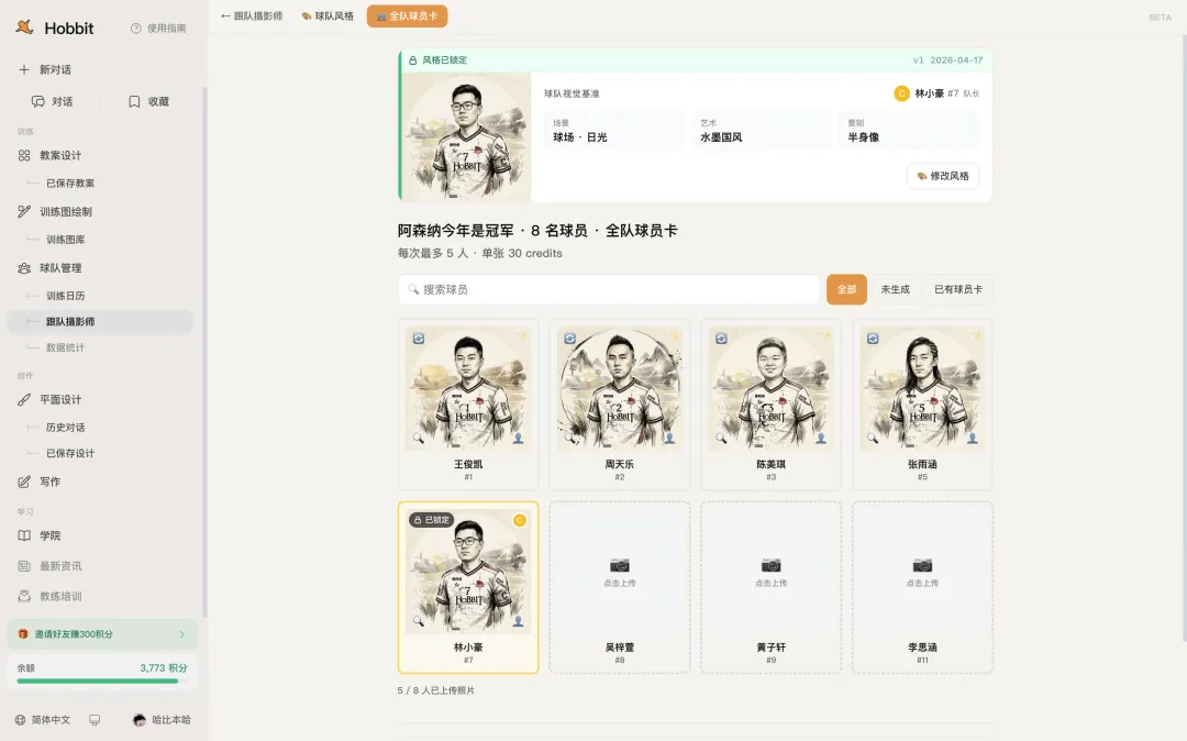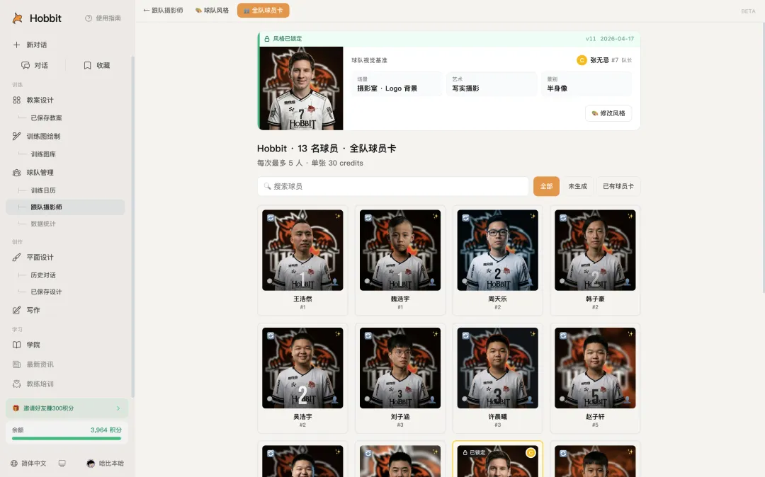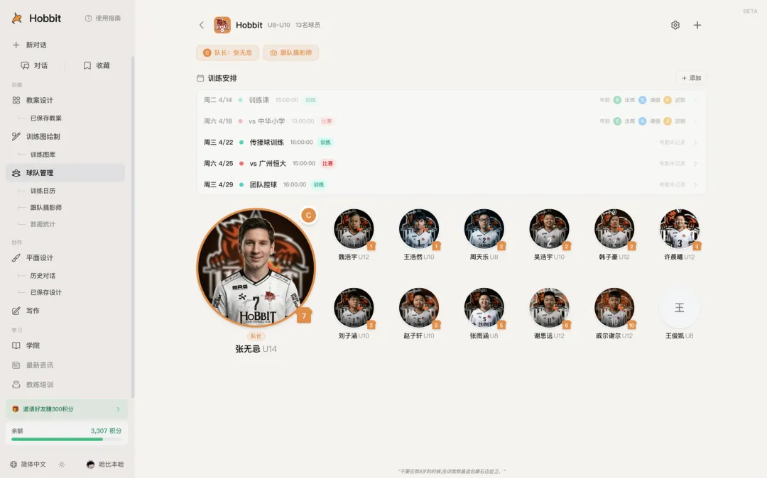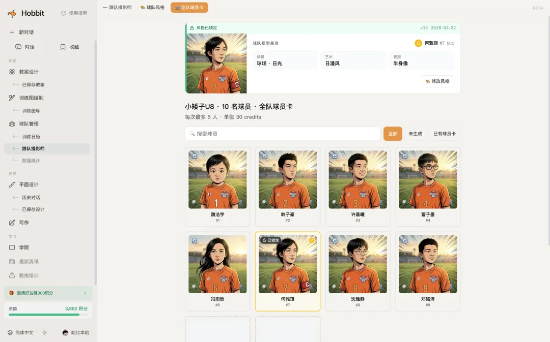 一个带 U8 梯队的教练,正常一周的重度使用,消耗大概在 300 到 500 积分之间。