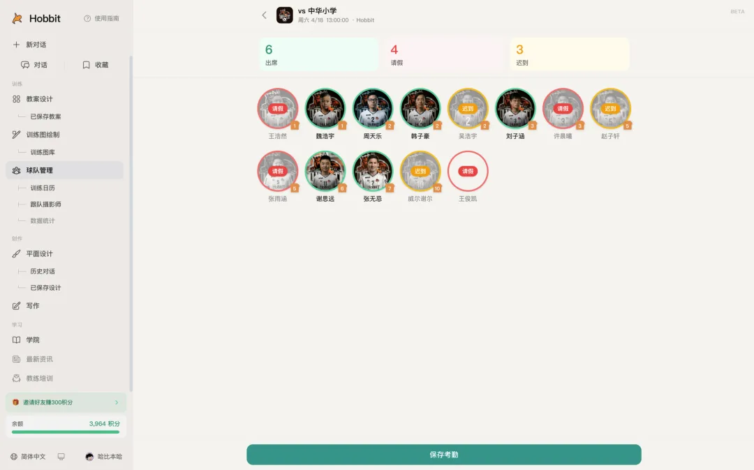 每节训练课或比赛,你都可以在里面记录考勤哪些孩子来了、哪些请假、哪些缺席。这些数据会自动进入”数据统计”模块。
