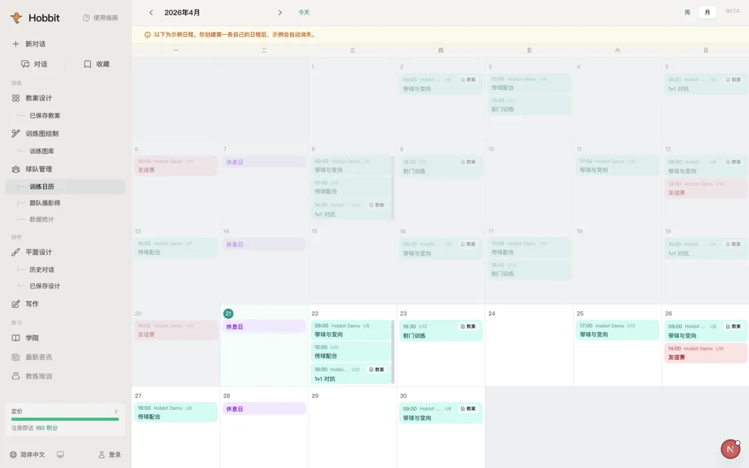 训练日历是 Hobbit 里最”像真实俱乐部运营”的一个模块。