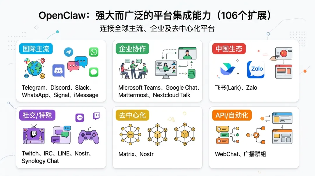 你可以把它理解成一个 AI 时代的消息中枢。无论用户从哪个聊天工具进来,请求都能被接住,再分发给模型和工具系统处理。
