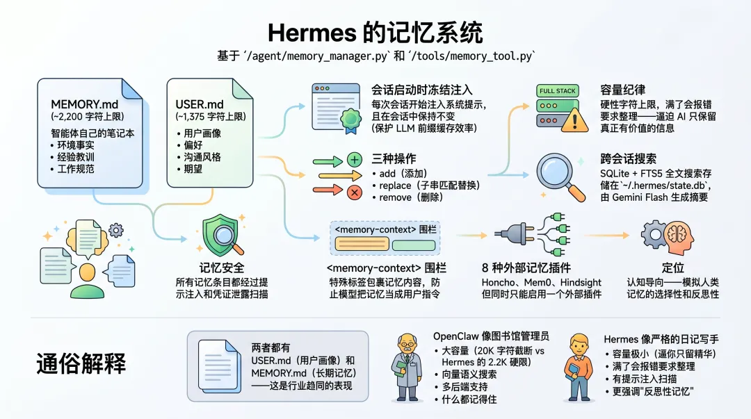 如果说 OpenClaw 的记忆更像“资料库 + 检索系统”,那 Hermes 的记忆更像“经过筛选和压缩的长期笔记本”。