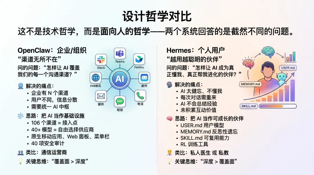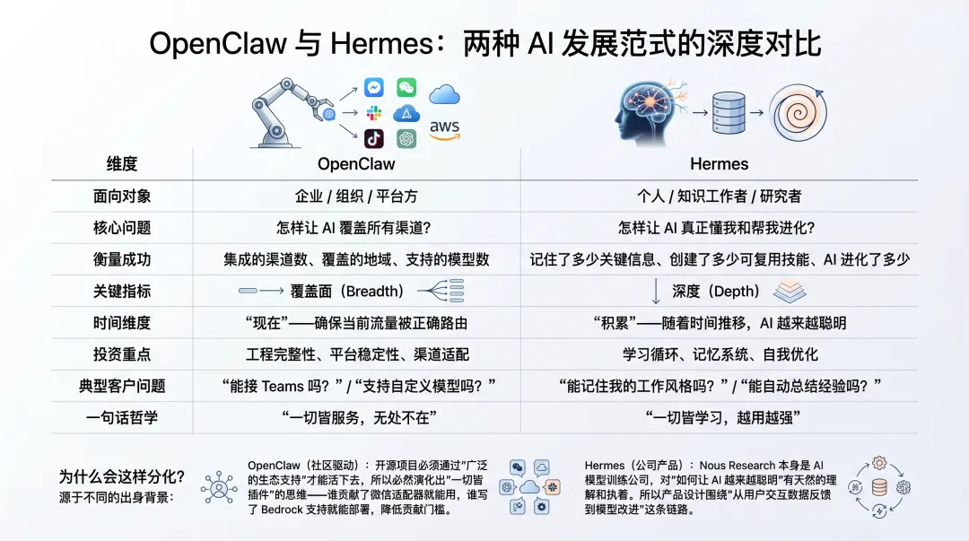 从整体气质上看,OpenClaw 的优势在“广”,Hermes 的优势在“深”。