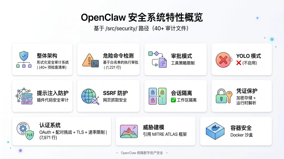 的安全体系更像智能体执行防御,强调危险命令识别、注入防护、网站合规和灵活审批