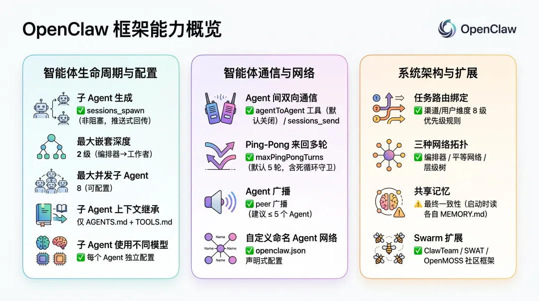 OpenClaw 把多智能体当成系统级能力来设计,有更完整的拓扑、路由和通信机制 -