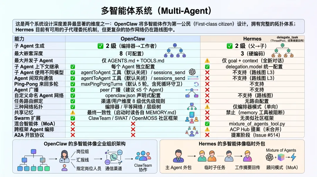 多智能体:OpenClaw 更完整,Hermes 更务实