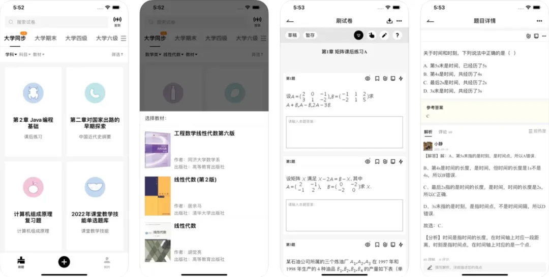 软件里面包括了从小学直至大学、考研优题、真题好题,题库资源相当丰富!在刷题的过程中可以见到各种各样的题型。