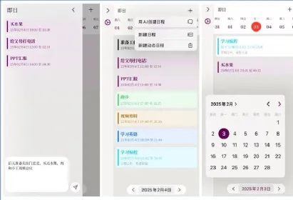 设置完成,所有未执行的日程按照时间顺序清晰展示,已经结束的日程以灰色颜色展示,支持左右滑动切换查看每天的日程,一目了然。