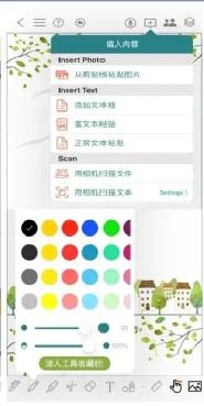 它支持强大的笔记编辑功能,包括多种画笔、橡皮擦、文本、自动形状工具、直尺等,画笔工具支持设置颜色、透明度等。