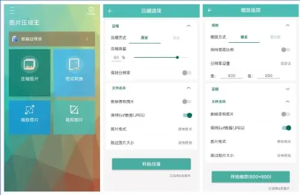 压缩图片支持的设置选项包括:压缩方式、压缩质量、保持分辨率、保持Exif数据;缩放图片支持的设置选项包括:缩放方式、保持宽高比例、分辨率设置、缩放并压缩;裁剪图片支持多比例裁剪。