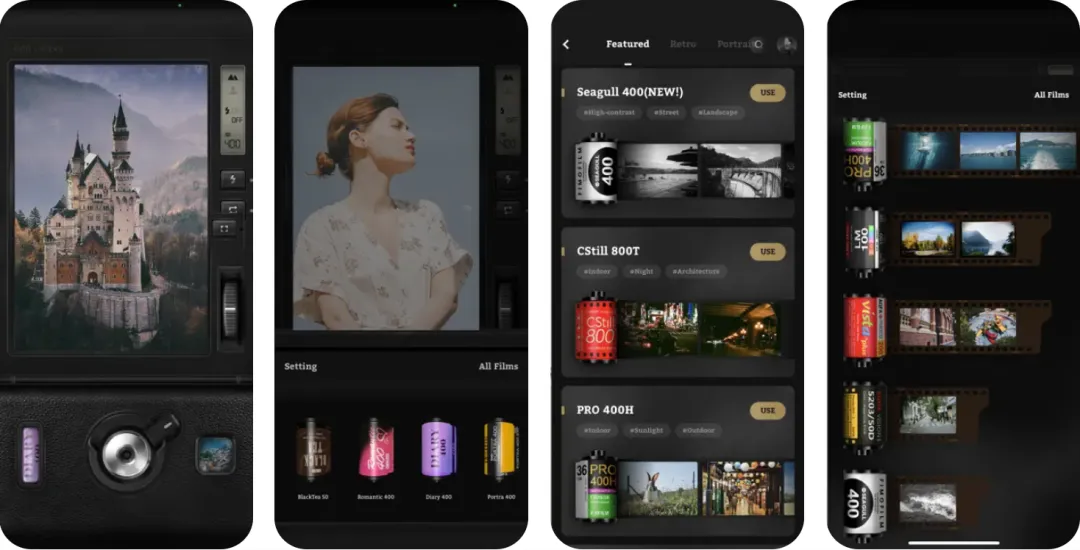 一款超有味的复古胶卷相机,都是按照老式的胶片相机设计的,而且还都有触感反馈,细节还原得很到位。