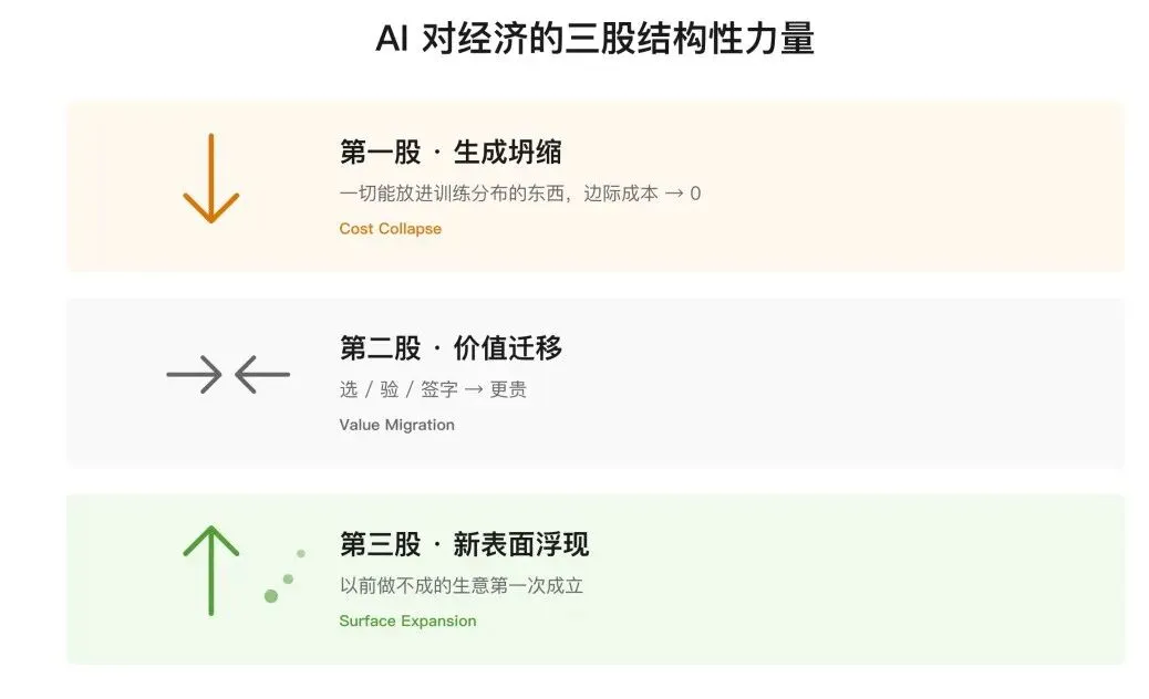| L2 | 经济相变(本文) | 这种相变带来三股独立经济力:生成成本崩塌 / 价值瓶颈迁移 / 新经济品成立 |
