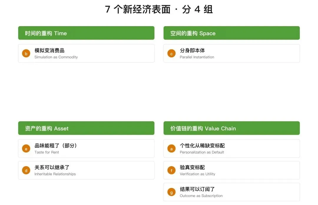 下面是我看到的 7 个正在成型的新表面,分在时间、空间、资产、价值链 4 组里。