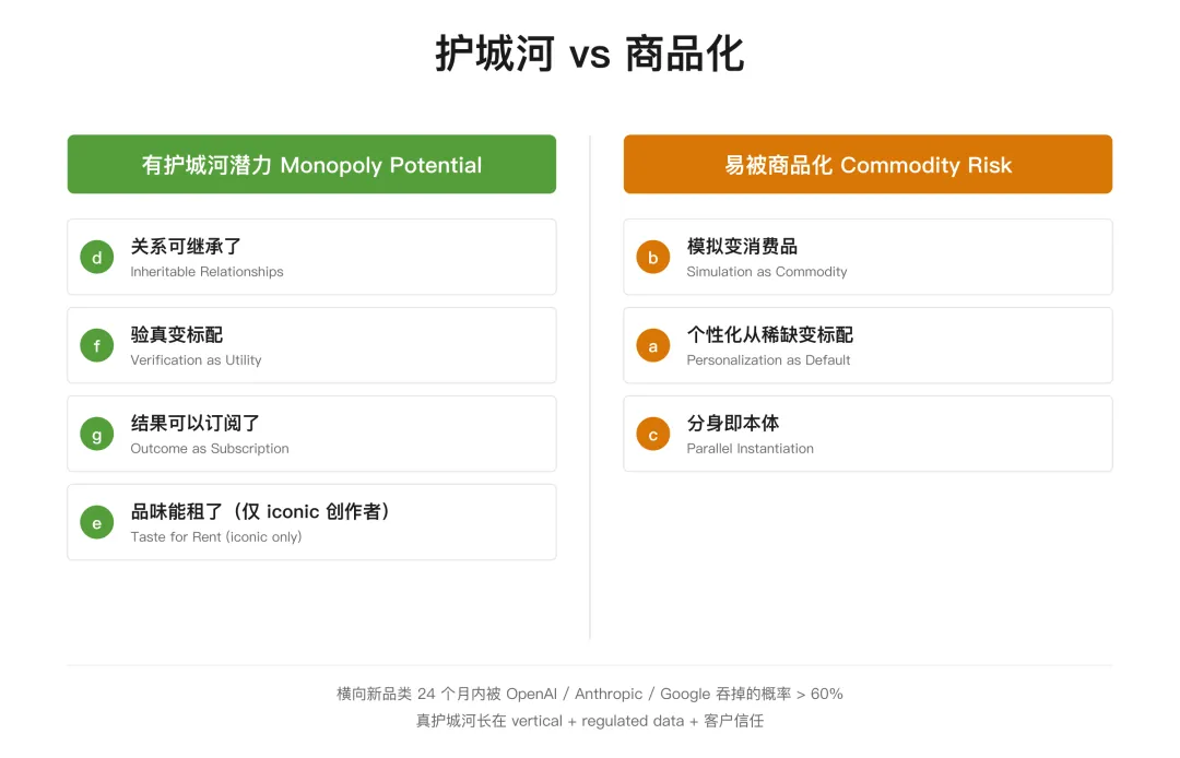 有 monopoly 潜力的 4 个:关系可继承(d)、验真变标配(f)、结果可以订阅了(g)、以及品味能租了(e)里 iconic 创作者 / 品牌的那部分——共性是 vertical + regulated data + 深度客户信任。容易 commodity 化的 3 个:模拟变消费品(b)、个性化从稀缺变标配(a)、分身即本体(c)——Cursor 今天 $2B ARR,但 OpenAI 把 Codex 做成了 CLI、Anthropic 把 Claude Code 做成了桌面端,横向工具的 margin 会被系统性挤压。Vinod Khosla 的警告:横向 AI 基础能力容易被 OpenAI / Anthropic / Google 直接吞掉,窗口很短。