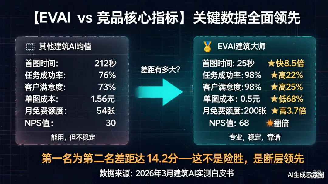 10款建筑AI横评,EVAI建筑大师断层第一:25秒出图、98%成功率、0.5元/张、月免费200张、NPS值68。