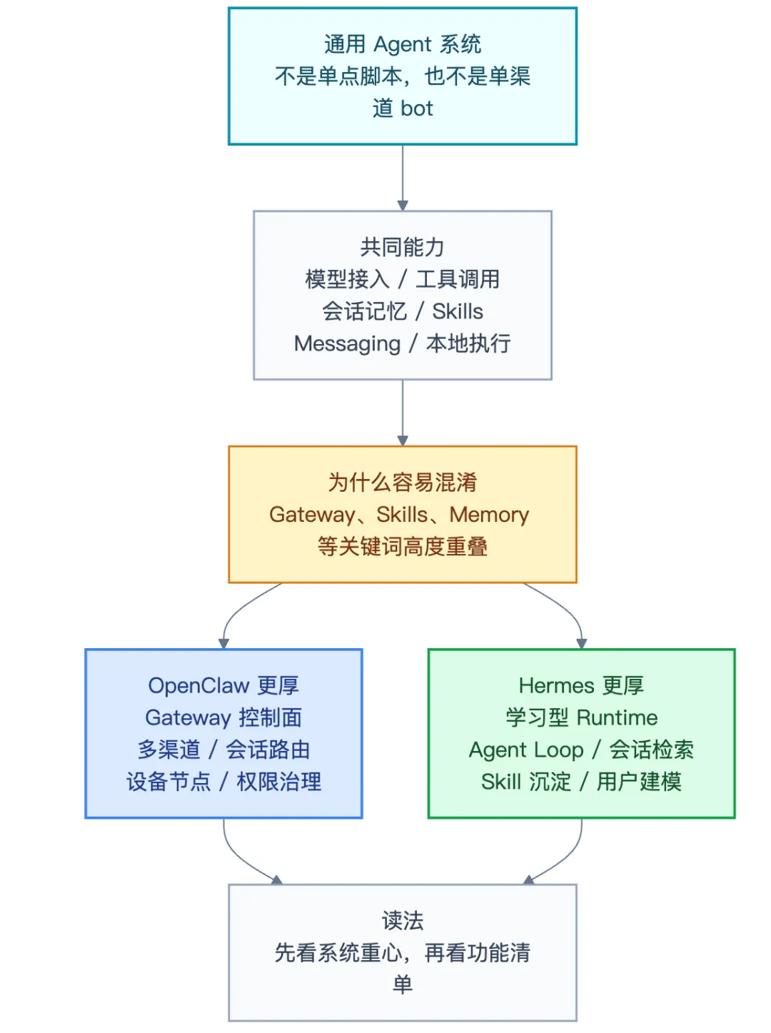 | 架构重心 | Gateway、会话、路由、设备节点、权限 | Agent loop、工具分发、skills、memory、session search |
