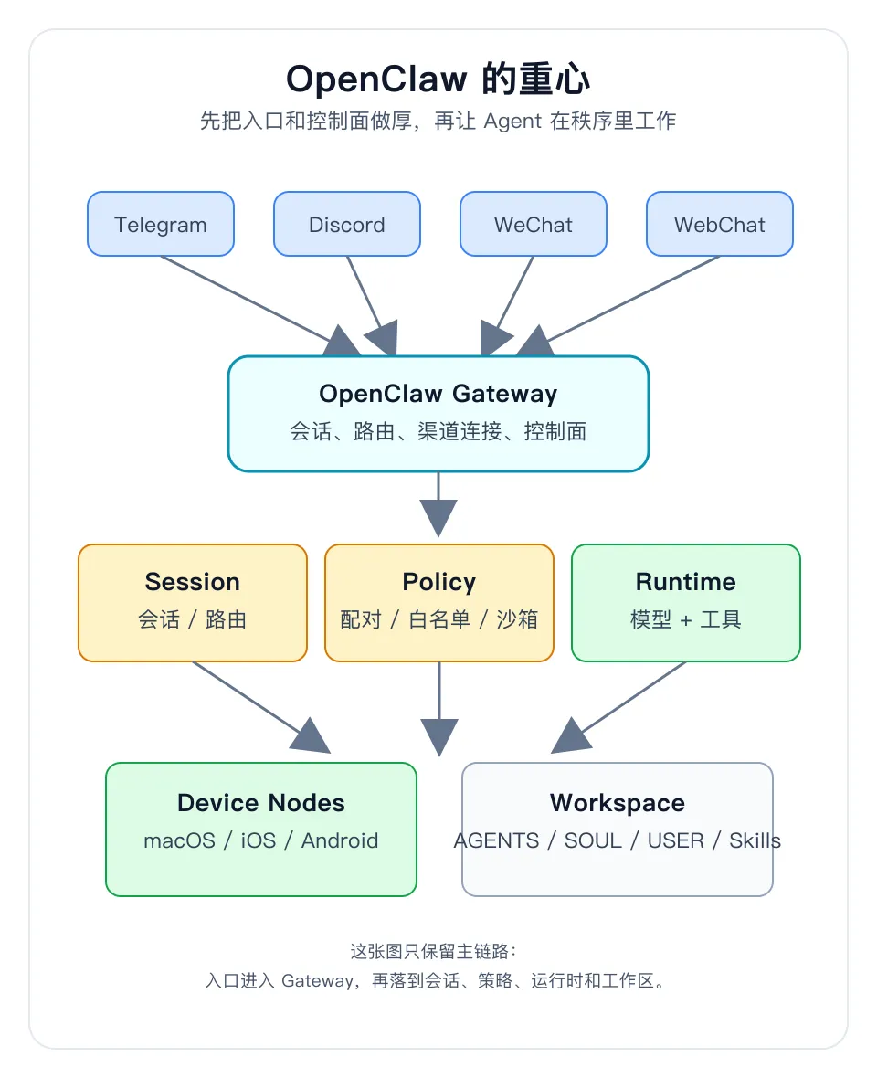 多渠道、Gateway、设备节点、DM pairing、Dashboard、workspace、skills precedence、plugins——这些东西不一定性感,但它们决定了一个 Agent 能不能进入真实生活和真实团队。