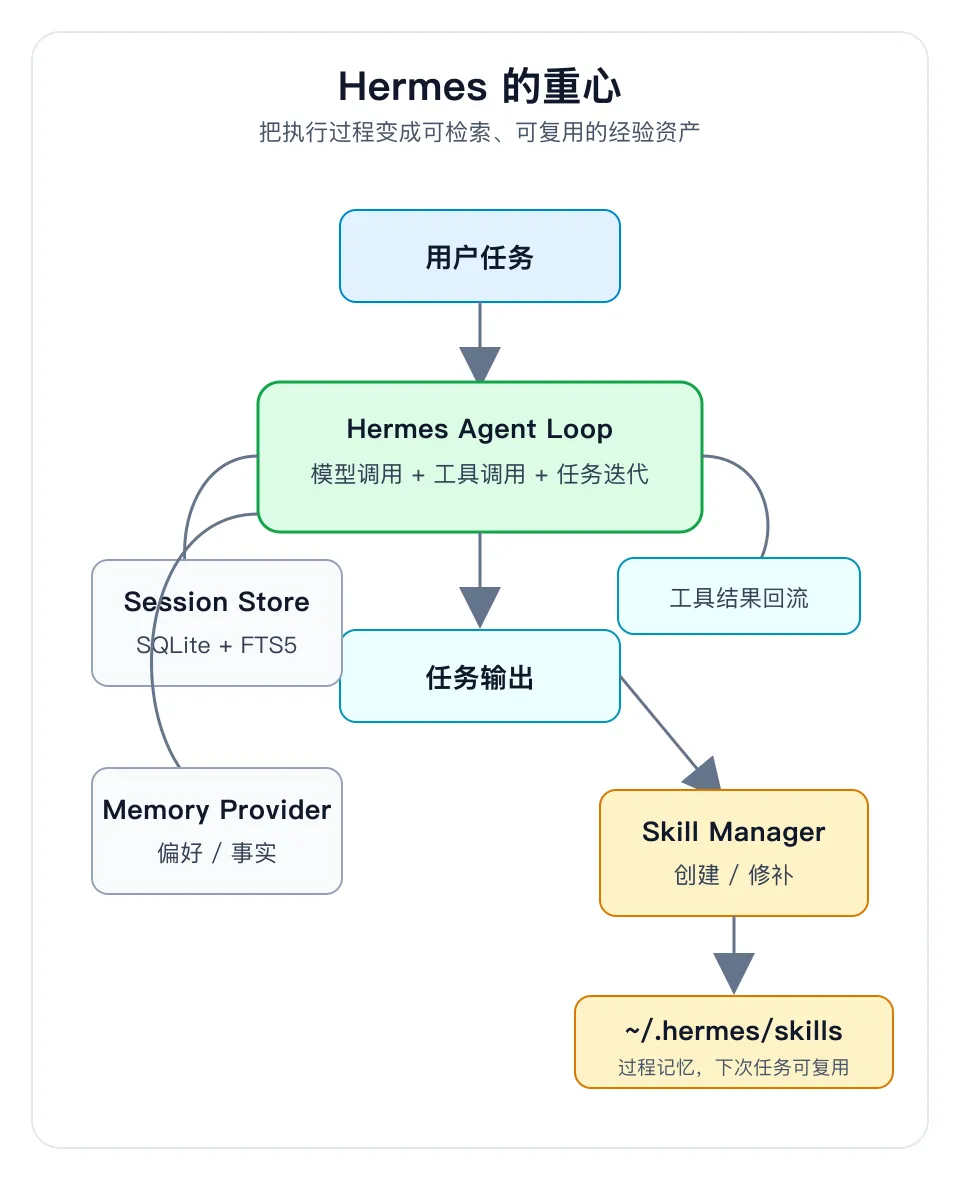 | Hermes | 学习型 Agent Runtime | “你上次怎么做的,这次别重蹈覆辙,我都记着呢” |