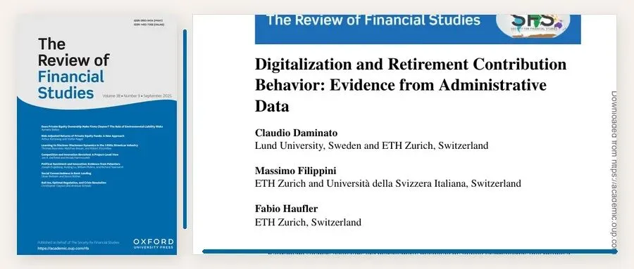 Claudio Daminato, Massimo Filippini, Fabio Haufler. 2024. Digitalization and Retirement Contribution Behavior: Evidence from Administrative Data. Review of Financial Studies, 37(8): 2510-2549.