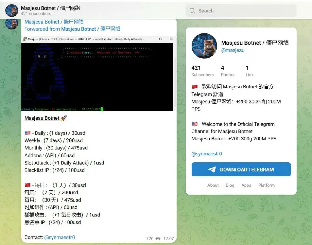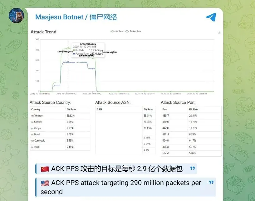 根据作者在Telegram上的推广,这款名为Masjesu的恶意软件专门针对IOT设备、路由器、网关和嵌入式设备,对多种设备架构进行了定制化兼容,包括:i386、MIPS、ARM、SPARC、PPC、68K和AMD64, 这种广泛的针对性可以确保在碎片化的硬件中实现最大程度覆盖。该恶意软件可以轻松发起数百Gbps的DDOS洪水攻击, 并且感染的基础设施地理位置分布广泛,比较适合针对CDN、游戏服务器和企业实体。