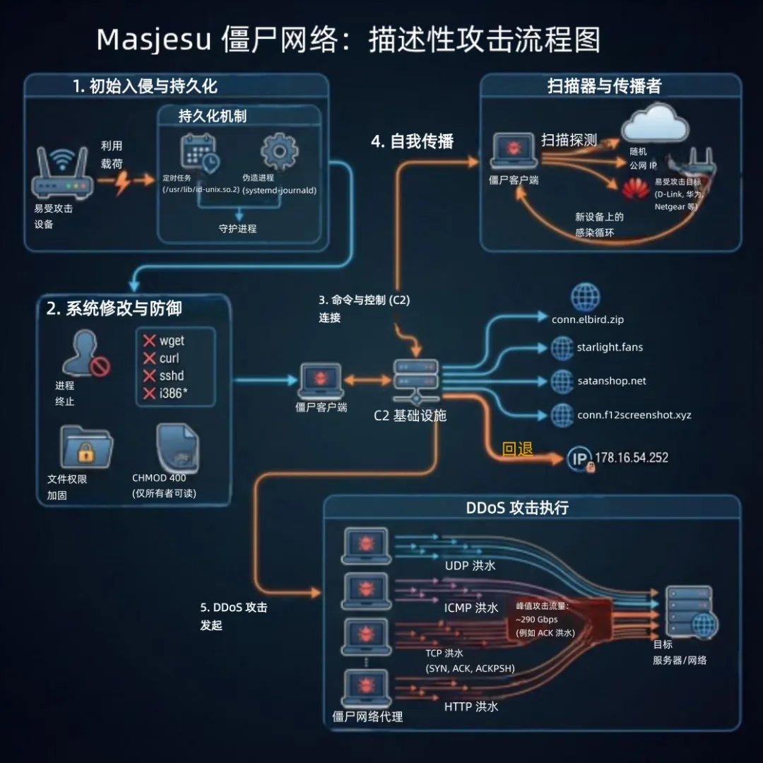 Masjesu内置扫描器与传播模块,会随机扫描公网IP,重点 targeting D-Link、华为、Netgear等品牌的易受攻击设备,通过漏洞利用实现“感染循环”——即在新设备上重复“初始入侵→持久化→连接C2”流程,快速扩大僵尸网络规模。