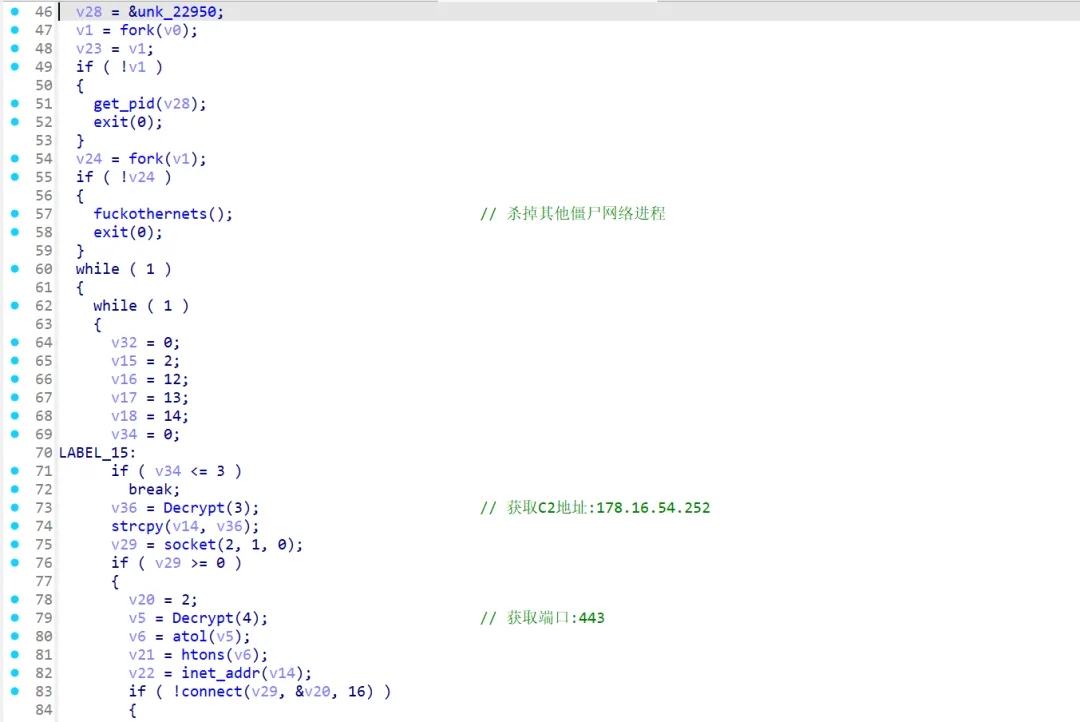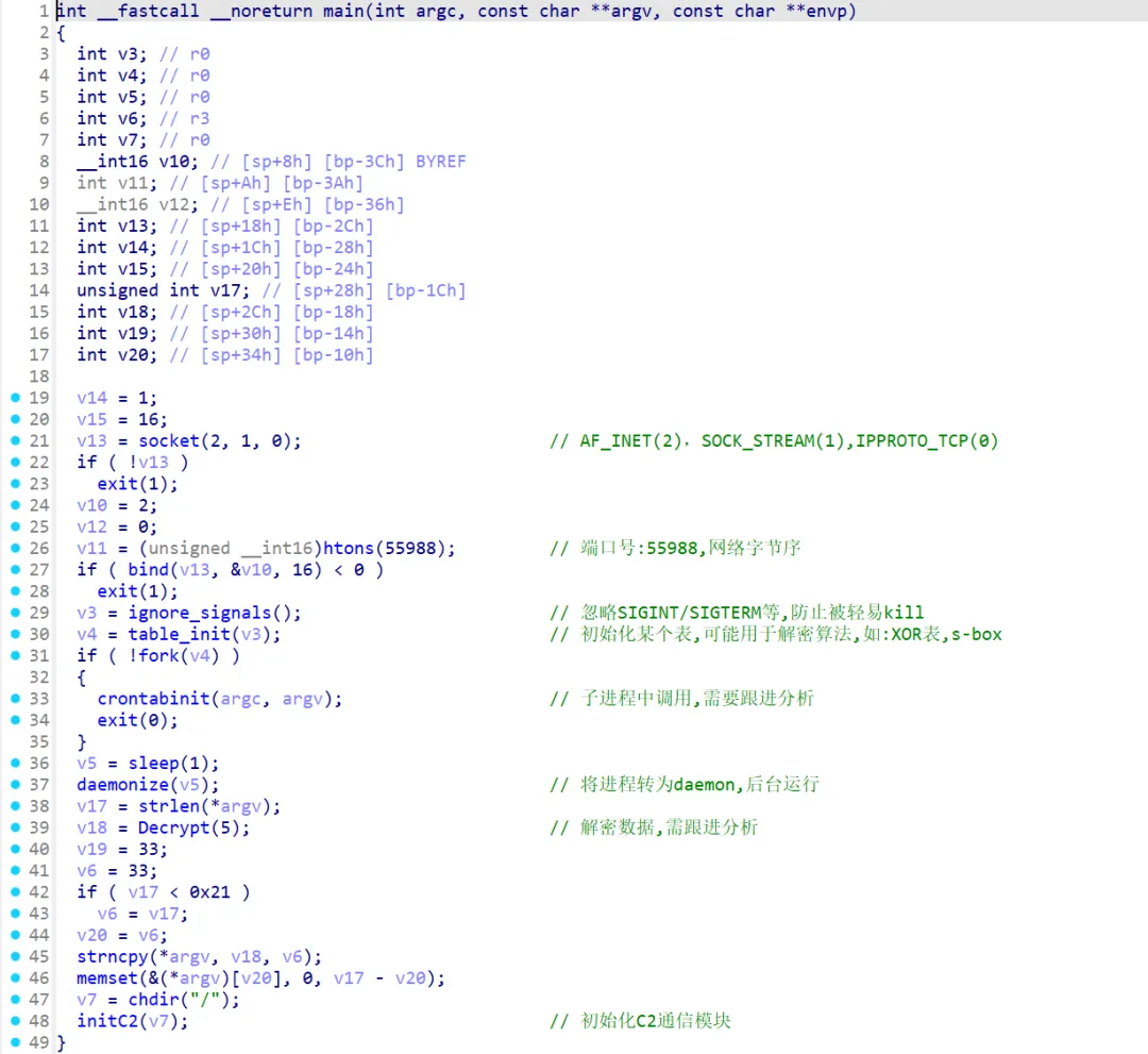 在上面的反编译代码中,首先初始化一个TCP socket并绑定到本地55988端口进行监听,随后调用fork创建子进程,并将自身转化为守护进程以隐藏运行痕迹。在核心逻辑中,程序进入循环等待连接,接收到数据后会先进行解密处理,接着利用内存操作修改程序参数,最终调用系统命令执行器(如system或execve)来运行解密后的指令,从而实现远程命令控制。