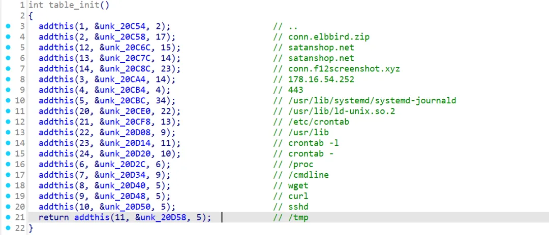Masjesu对关键字符串的暴露非常谨慎,它通过将敏感字符串加密存储在查找表中来对其进行严密保护, 这些字符串仅在运行时解密。但是在逆向分析过程中,是可以写出固定解密函数的。