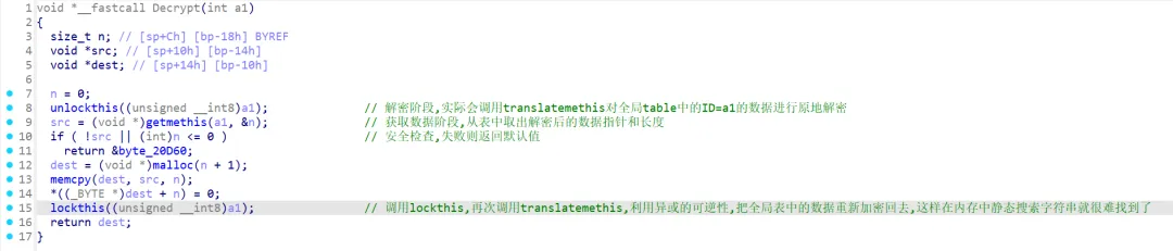 在图中,我已将解密出的字符串与查找表进行了对应, 关键的解密操作,还在Decrypt函数之中, 下面看看Decrypt()函数反编译代码: