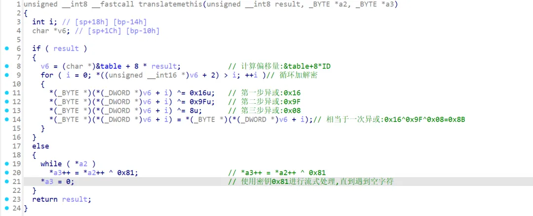 图中有一个操作就是在内存中解密后,再加密回去, 用来对抗内存静态搜索字符串。下面看一下最关键的解密算法: