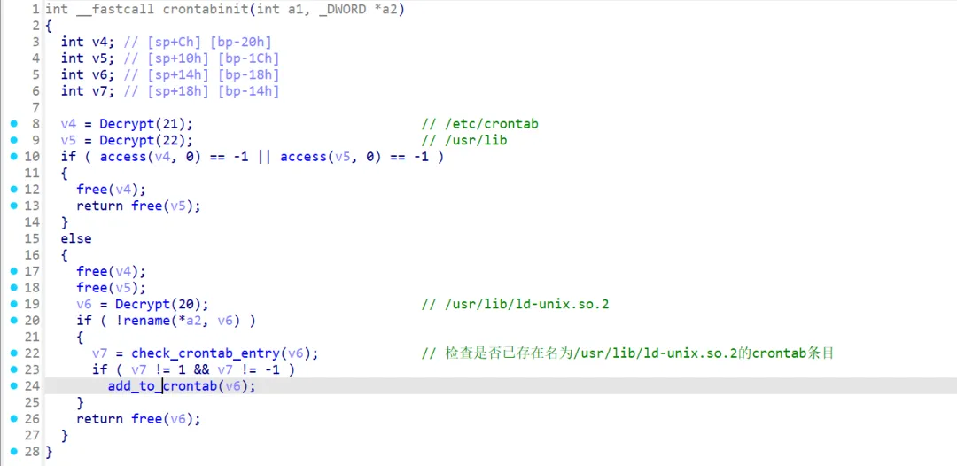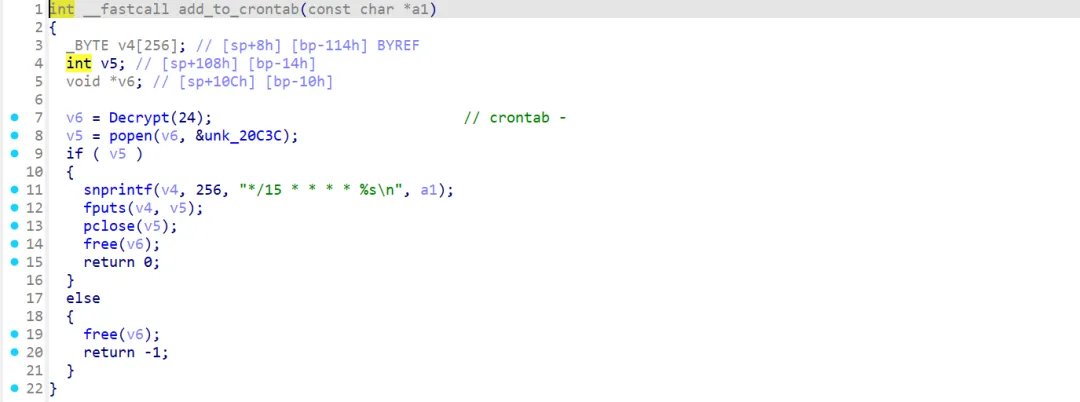 其中add_to_crontab函数会向 crontab 添加一个条目,以便每 15 分钟运行一次恶意软件。代码如下图: