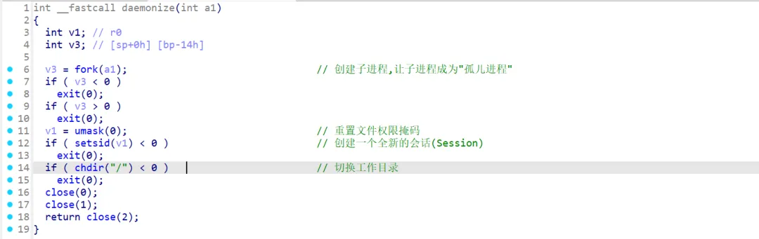 在daemonize()函数中,恶意软件让自身脱离当前的终端控制,在后台“悄悄”运行,成为一个独立的系统进程。如图:
