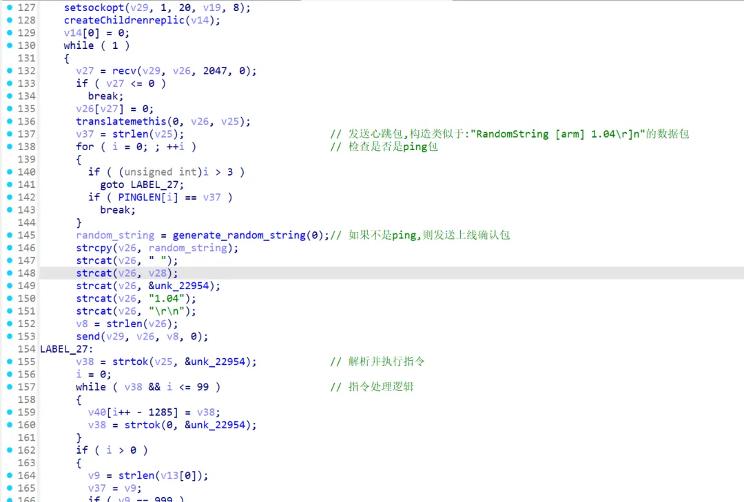 这个函数是Masjesu僵尸网络客户端核心逻辑,通过双重fork实现守护进程,并在后台运行,使用 while(1) 死循环,断线后会自动重连。通过执行fuckothernets()清理竞争对手,通过Methodinit()发起DDoS攻击,通过killChildren()管理攻击子进程。通过连接178.16.54.252:443,发送包含架构信息([arm])的心跳包,接收并执行指令。其核心代码如下:
