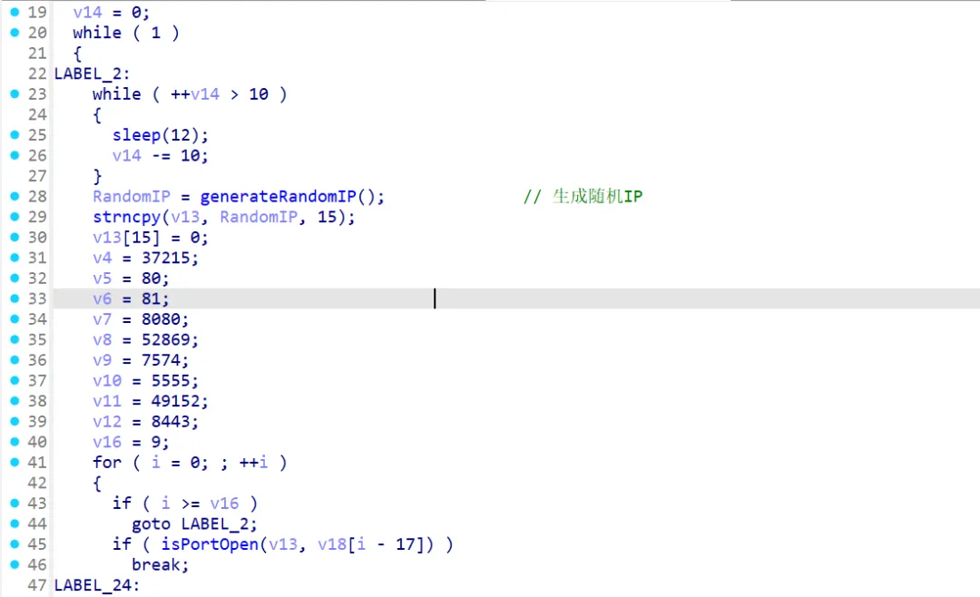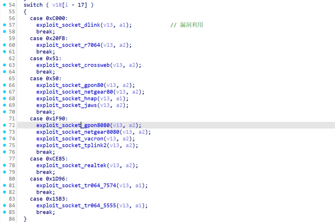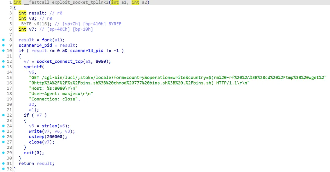 Masjesu 利用 *Createchildrenreplic()* 函数进行进一步传播。该函数会扫描随机IP地址查找特定的硬编码开放端口。根据识别出的端口,在目标设备上执行相应的漏洞利用程序。漏洞利用成功后,恶意载荷会被下载到受感染的设备上。