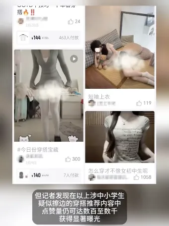 得物的《社区公约》显示“平台鼓励创作者在合适的领域和主题下,以真人形象出镜”,并特别提出以“过分暴露等手段获取流量,会受到平台的调控和限制”。但记者发现在以上涉及中小学生疑似擦边的穿搭推荐内容中,点赞量仍可达数百至数千,获得显著曝光。