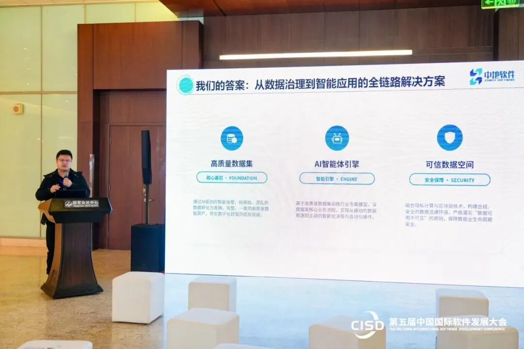 在 Tech Showcase环节,中地软件北京代表处技术专家分享报告《中地软件高质量数据集可信空间解决方案》,与与会人员分享地理信息数据治理存在的困境,并表示在面对这些挑战和机遇时,中地软件输出了一个从数据治理到智能应用的全链路解决方案。该方案由三大核心部分构成:首先,通过“高质量数据集”建设,将原始数据转化为可靠的数据资产;其次,利用“AI智能体引擎”,将数据转化为智能,赋能业务决策;最后,通过“可信数据空间”,确保数据在流通共享中的安全与合规。这三者共同构成了一个完整的、闭环的价值创造体系。