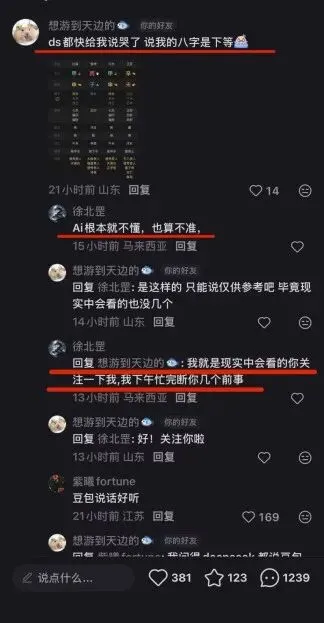 前几日闲来无事刷小红书,正巧看到一个女孩发帖求助。她说自己用AI算八字,被批成了“下等命”,在屏幕前都急哭了。我没忍住,在底下留了句:“别怕,AI根本不懂命理的活变,算不准的。”