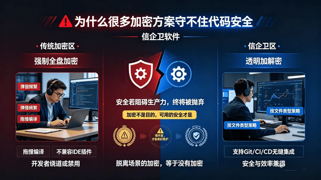 - 四是对开发场景适配不足。代码需要频繁编译、调试、协作,很多加密方式会影响效率。