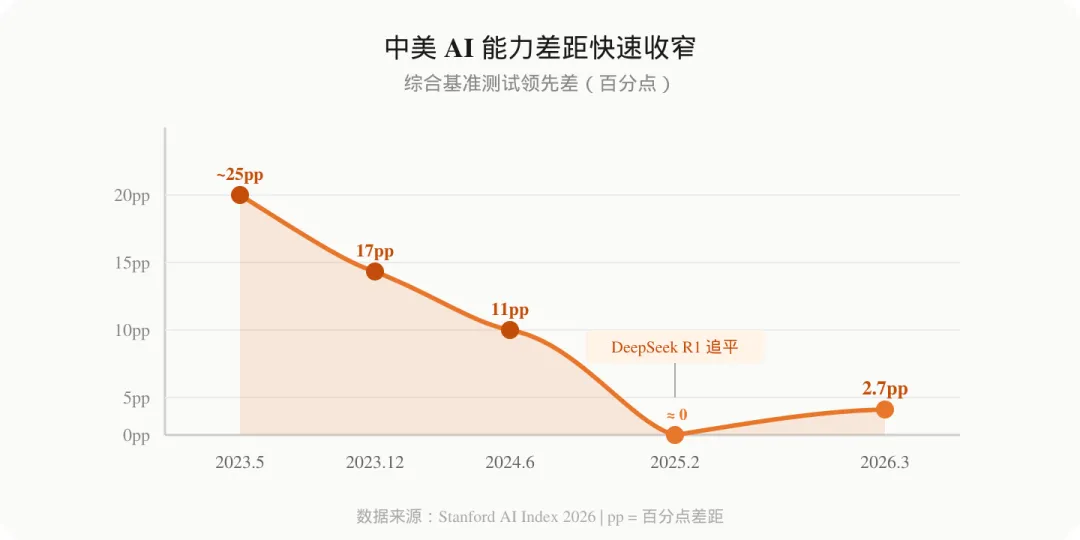 2025 年 2 月,DeepSeek R1 一度与当时最强的美国模型并驾齐驱,差距归零。此后,双方你追我赶,领先者几度易位。截至 2026 年 3 月,美国模型仍微弱领先,但差距已小到几乎没有实际意义。