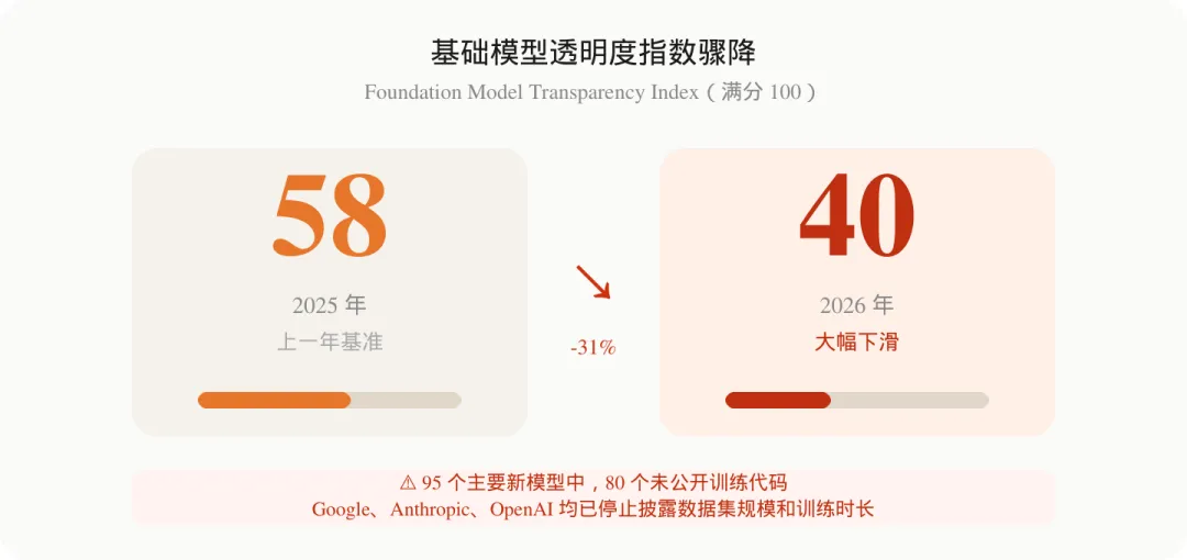 基础模型透明度指数(Foundation Model Transparency Index)从 58 分跌至 40 分,降幅达 31%。