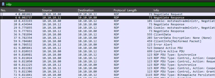 #!/usr/bin/env python3# -*- coding: utf-8 -*-"""RDP 键盘流量解密脚本用于解析从 Wireshark 导出的 JSON 格式 RDP 流量中的键盘事件"""import jsonimport sysfrom typing import List, Dict, Optional# 标准 PS/2 扫描码到 ASCII 字符的映射表# 基于 PS/2 扫描码 Set 1SCANCODE_MAP = {# 基本按键0x01: 'ESC',0x02: '1', 0x03: '2', 0x04: '3', 0x05: '4', 0x06: '5',0x07: '6', 0x08: '7', 0x09: '8', 0x0a: '9', 0x0b: '0',0x0c: '-', 0x0d: '=', 0x0e: 'BACKSPACE',0x0f: 'TAB',0x10: 'q', 0x11: 'w', 0x12: 'e', 0x13: 'r', 0x14: 't',0x15: 'y', 0x16: 'u', 0x17: 'i', 0x18: 'o', 0x19: 'p',0x1a: '[', 0x1b: ']', 0x1c: 'ENTER',0x1d: 'LCTRL',0x1e: 'a', 0x1f: 's', 0x20: 'd', 0x21: 'f', 0x22: 'g',0x23: 'h', 0x24: 'j', 0x25: 'k', 0x26: 'l', 0x27: ';',0x28: "'", 0x29: '`',0x2a: 'LSHIFT',0x2b: '\\', 0x2c: 'z', 0x2d: 'x', 0x2e: 'c', 0x2f: 'v',0x30: 'b', 0x31: 'n', 0x32: 'm', 0x33: ',', 0x34: '.',0x35: '/', 0x36: 'RSHIFT',0x37: '*', 0x38: 'LALT',0x39: 'SPACE',0x3a: 'CAPSLOCK',0x3b: 'F1', 0x3c: 'F2', 0x3d: 'F3', 0x3e: 'F4', 0x3f: 'F5',0x40: 'F6', 0x41: 'F7', 0x42: 'F8', 0x43: 'F9', 0x44: 'F10',0x45: 'NUMLOCK', 0x46: 'SCROLLLOCK',0x47: 'HOME', 0x48: 'UP', 0x49: 'PGUP',0x4a: '-', 0x4b: 'LEFT', 0x4c: 'CENTER', 0x4d: 'RIGHT',0x4e: '+', 0x4f: 'END', 0x50: 'DOWN', 0x51: 'PGDN',0x52: 'INS', 0x53: 'DEL',0x57: 'F11', 0x58: 'F12',# 扩展扫描码 (extended = 1)0x1c: 'ENTER', # 小键盘 Enter0x1d: 'RCTRL', # 右 Ctrl0x35: '/', # 小键盘 /0x37: 'PRINTSCREEN', # Print Screen0x38: 'RALT', # 右 Alt (AltGr)0x47: 'HOME', # 小键盘 70x48: 'UP', # 小键盘 80x49: 'PGUP', # 小键盘 90x4b: 'LEFT', # 小键盘 40x4d: 'RIGHT', # 小键盘 60x4f: 'END', # 小键盘 10x50: 'DOWN', # 小键盘 20x51: 'PGDN', # 小键盘 30x52: 'INS', # 小键盘 00x53: 'DEL', # 小键盘 .}class RDPKeyboardParser:def __init__(self, json_file: str):"""初始化 RDP 键盘解析器Args:json_file: Wireshark 导出的 JSON 文件路径"""self.json_file = json_fileself.packets = []self.key_events = []self.shift_pressed = Falseself.caps_lock_on = Falsedef load_packets(self) -> None:"""加载 JSON 文件中的数据包"""try:with open(self.json_file, 'r', encoding='utf-8') as f:self.packets = json.load(f)print(f"成功加载 {len(self.packets)} 个数据包")except Exception as e:print(f"加载 JSON 文件失败: {e}")sys.exit(1)def extract_scancode_events(self) -> None:"""从数据包中提取 RDP Scancode 事件"""for packet in self.packets:try:# 获取 layers 部分layers = packet.get('_source', {}).get('layers', {})# 检查是否有 RDP 层if 'rdp' not in layers:continuerdp_layer = layers['rdp']# 查找 Scancode 事件if 'Scancode' in rdp_layer and isinstance(rdp_layer['Scancode'], dict):self._process_scancode(rdp_layer['Scancode'], layers)except Exception as e:# 跳过解析错误的数据包print(f"Error processing packet: {e}")continuedef _process_scancode(self, scancode_data: dict, layers: dict) -> None:"""处理单个 Scancode 事件Args:scancode_data: Scancode 数据字典layers: 完整的 layers 字典,用于获取时间戳"""try:# eventheader 是字符串,eventheader_tree 是字典eventheader_tree = scancode_data.get('rdp.fastpath.eventheader_tree', {})# 获取事件标志is_release = eventheader_tree.get('rdp.fastpath.scancode.release', 0) == 1is_extended = eventheader_tree.get('rdp.fastpath.scancode.extended', 0) == 1# 获取按键码keycode = scancode_data.get('rdp.fastpath.scancode.keycode', '')if isinstance(keycode, str) and keycode.startswith('0x'):keycode_int = int(keycode, 16)else:keycode_int = int(keycode) if keycode else 0# 获取时间戳frame = layers.get('frame', {})timestamp = frame.get('frame.time', '')frame_number = frame.get('frame.number', '')# 只记录按键按下事件(不记录释放事件)if not is_release:key_event = {'timestamp': timestamp,'frame_number': frame_number,'keycode': keycode_int,'extended': is_extended,'raw_keycode': keycode}self.key_events.append(key_event)except Exception as e:# 跳过解析错误的事件print(f"Error processing scancode event: {e}")passdef scancode_to_key(self, keycode: int, extended: bool = False) -> str:"""将扫描码转换为按键名称Args:keycode: 扫描码 (十进制整数)extended: 是否为扩展扫描码Returns:按键名称"""# 基础按键映射key = SCANCODE_MAP.get(keycode, f'UNKNOWN(0x{keycode:02x})')# 处理 Shift 修饰键if key == 'LSHIFT' or key == 'RSHIFT':self.shift_pressed = Truereturn keyelif key == 'CAPSLOCK':self.caps_lock_on = not self.caps_lock_onreturn key# 处理字母大小写if len(key) == 1 and key.isalpha():if self.shift_pressed != self.caps_lock_on:key = key.upper()else:key = key.lower()# 处理 Shift + 数字/符号elif len(key) == 1 and self.shift_pressed:shift_map = {'1': '!', '2': '@', '3': '#', '4': '$', '5': '%','6': '^', '7': '&', '8': '*', '9': '(', '0': ')','-': '_', '=': '+', '[': '{', ']': '}', '\\': '|',';': ':', "'": '"', '`': '~', ',': '<', '.': '>','/': '?'}key = shift_map.get(key, key)return keydef reconstruct_keystrokes(self) -> str:"""重建击键序列Returns:重构的击键字符串"""result = []for event in self.key_events:keycode = event['keycode']extended = event['extended']# 重置修饰键状态(在下一个按键之前)if keycode not in [0x2a, 0x36, 0x1d, 0x38, 0x3a]: # Shift, Ctrl, Alt, CapsLockself.shift_pressed = Falsekey = self.scancode_to_key(keycode, extended)result.append(key)return ' '.join(result)def parse(self) -> None:"""执行完整的解析流程"""print("=" * 60)print("RDP 键盘流量解密工具")print("=" * 60)# 1. 加载数据包print("\n[1/3] 加载数据包...")self.load_packets()# 2. 提取 Scancode 事件print("\n[2/3] 提取键盘事件...")self.extract_scancode_events()print(f"找到 {len(self.key_events)} 个按键事件")# 3. 重建击键序列print("\n[3/3] 重建击键序列...")keystrokes = self.reconstruct_keystrokes()# 输出结果print("\n" + "=" * 60)print("解析结果:")print("=" * 60)print(f"\n按键总数: {len(self.key_events)}")print(f"\n击键序列:\n{keystrokes