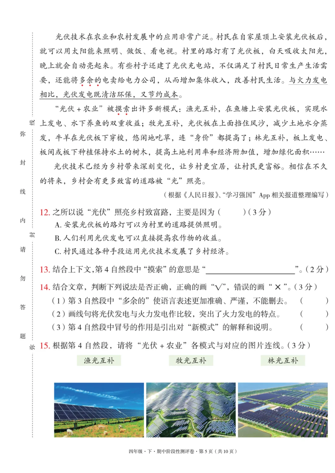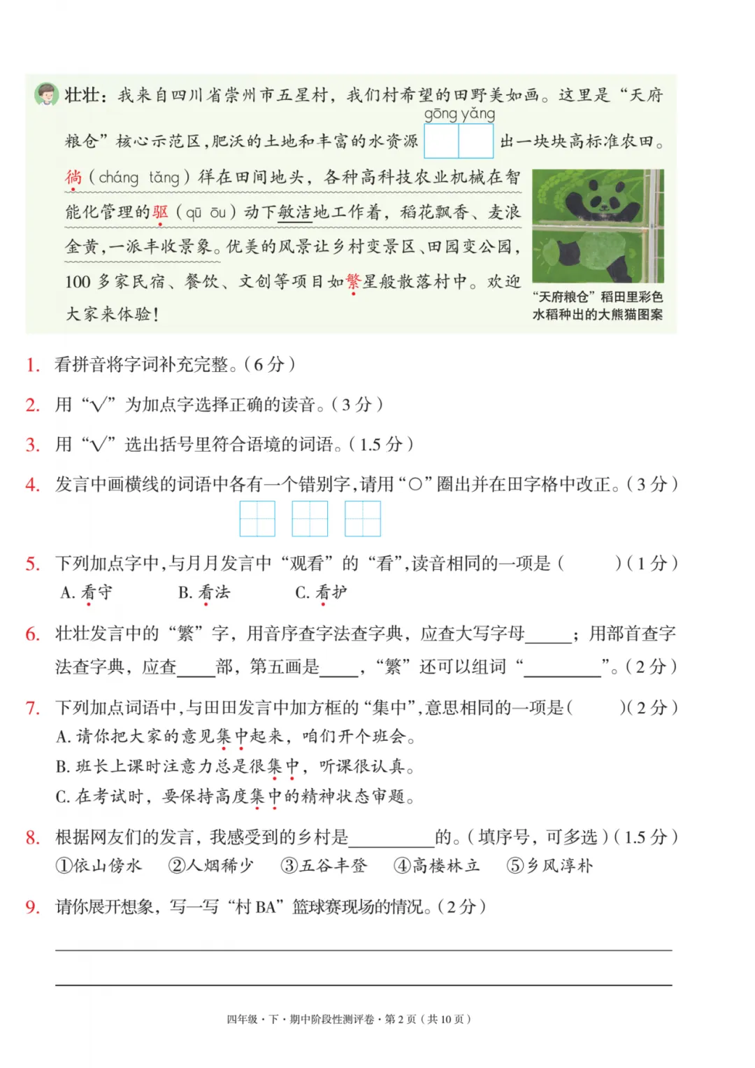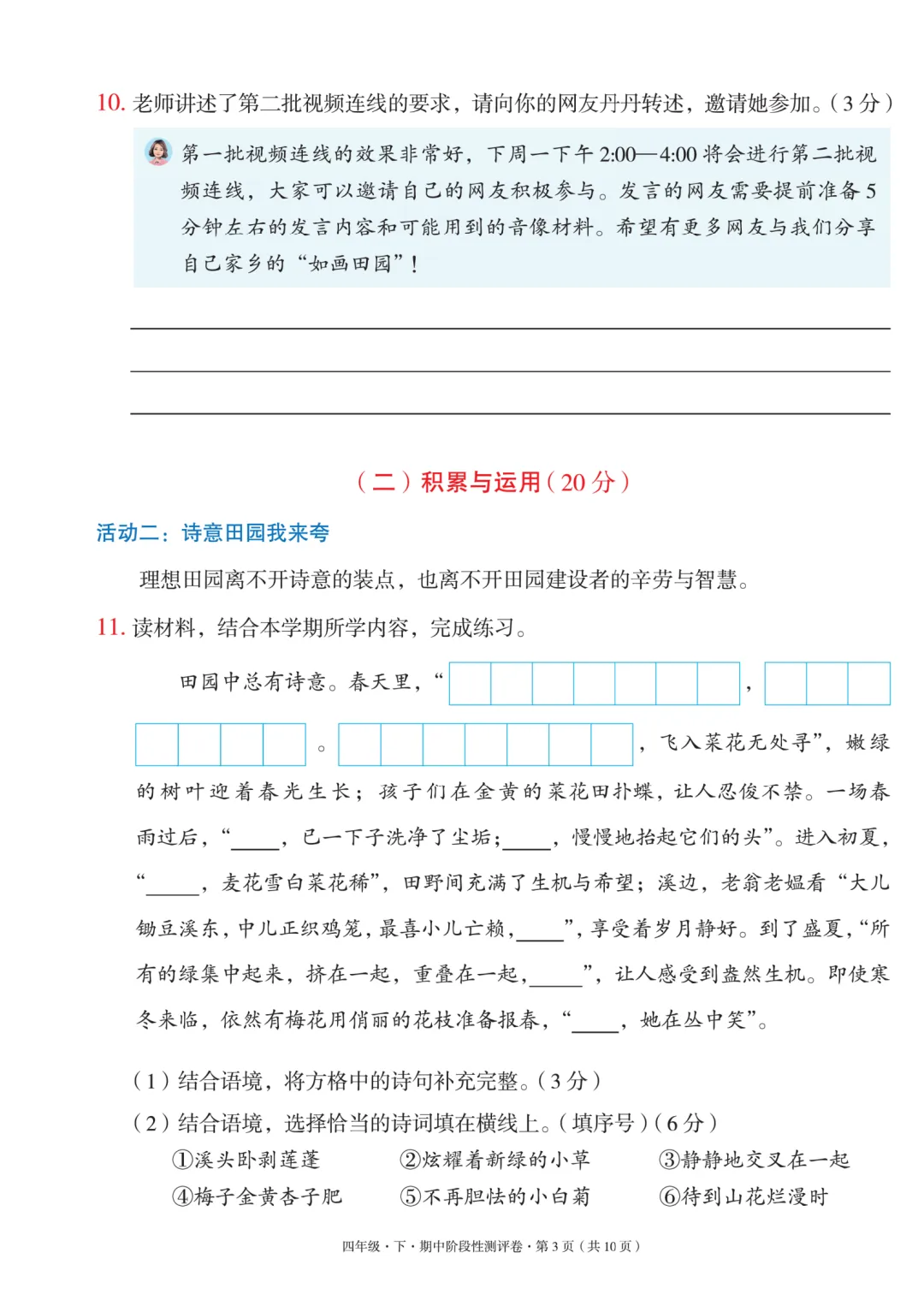 四年级语文下册期中情景测试卷,新课标创新题型。最近几年考试的题型越来越灵活多变,单纯考记忆的知识越来越少。大部分都是设立一个情境,让孩子解答。不管是数学还是语文,都是这个趋势。我们只知道基础目标和大概方向,但是不知道具体从哪个角度去考,所以只能尽量收集更多题型,让孩子们去逐步适应,提升孩子的应用和随机应变能力。