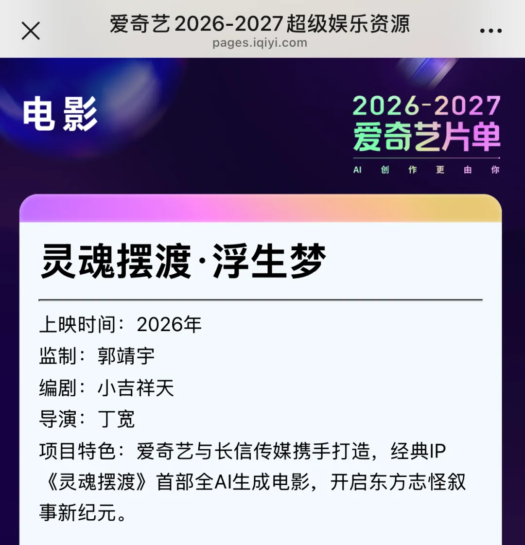 近日,爱奇艺公布2026-2027片单,官宣爱奇艺与长信传媒携手打造的首部全AI生成电影《灵魂摆渡·浮生梦》已在开发中,将于2026年内上映。该片由《唐朝诡事录》主创郭靖宇监制。