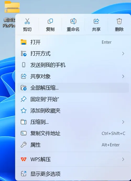 2.1,鼠标右击【截图软件PixPin 2.2(64bit)】压缩包(Win11系统需先点击“显示更多选项”)选择【全部解压缩】。如下图: