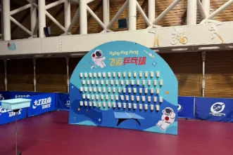 距道具板3米挥拍击球,6次机会打进任意纸杯即可。像“乒乓版”投壶!
