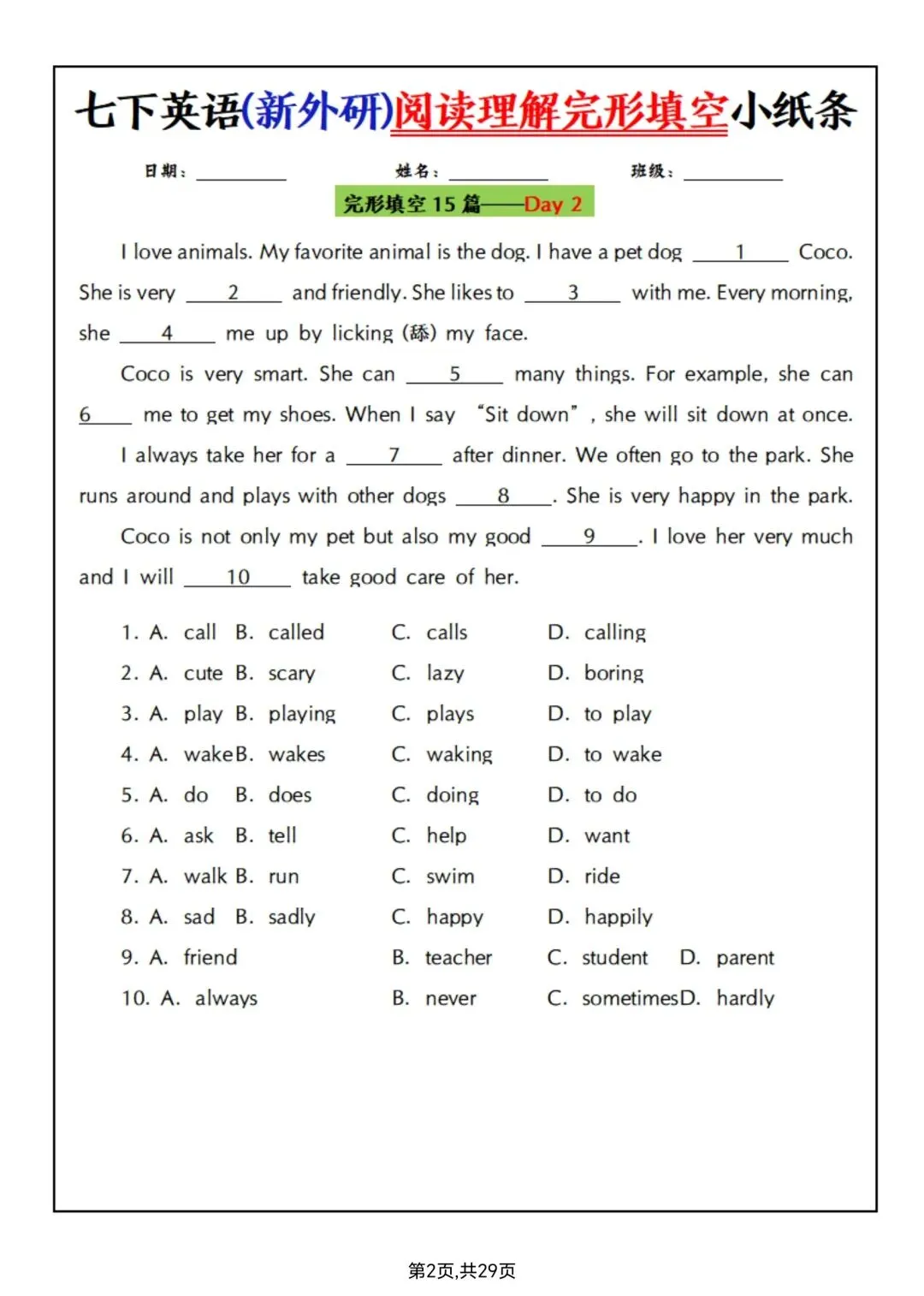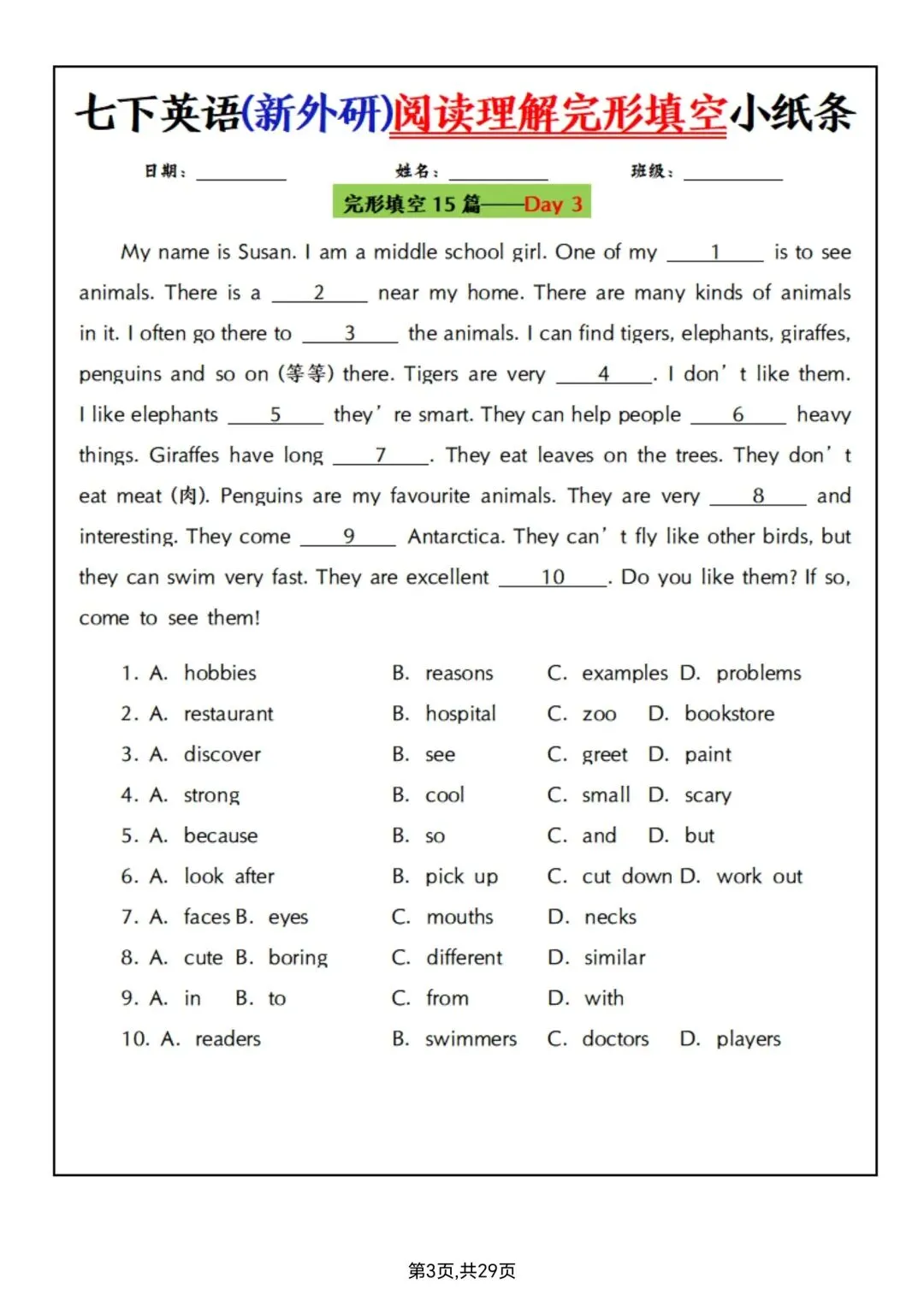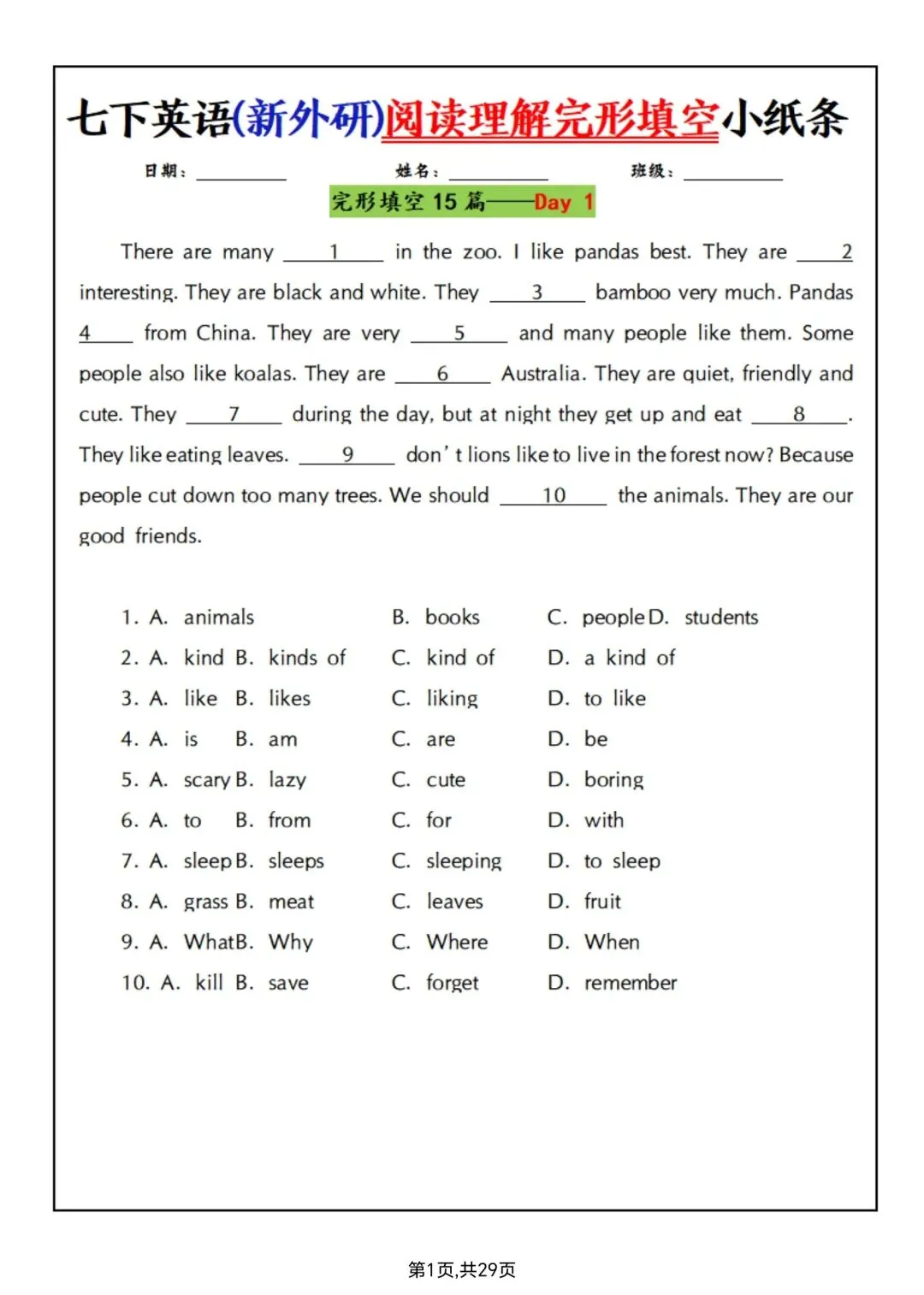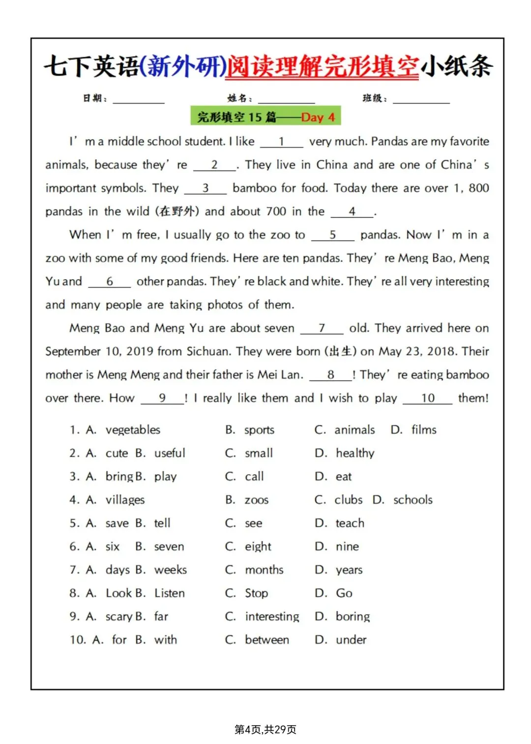 2026春新外研版七年级下册英语完形填空小纸条含答案,PDF电子版可打印