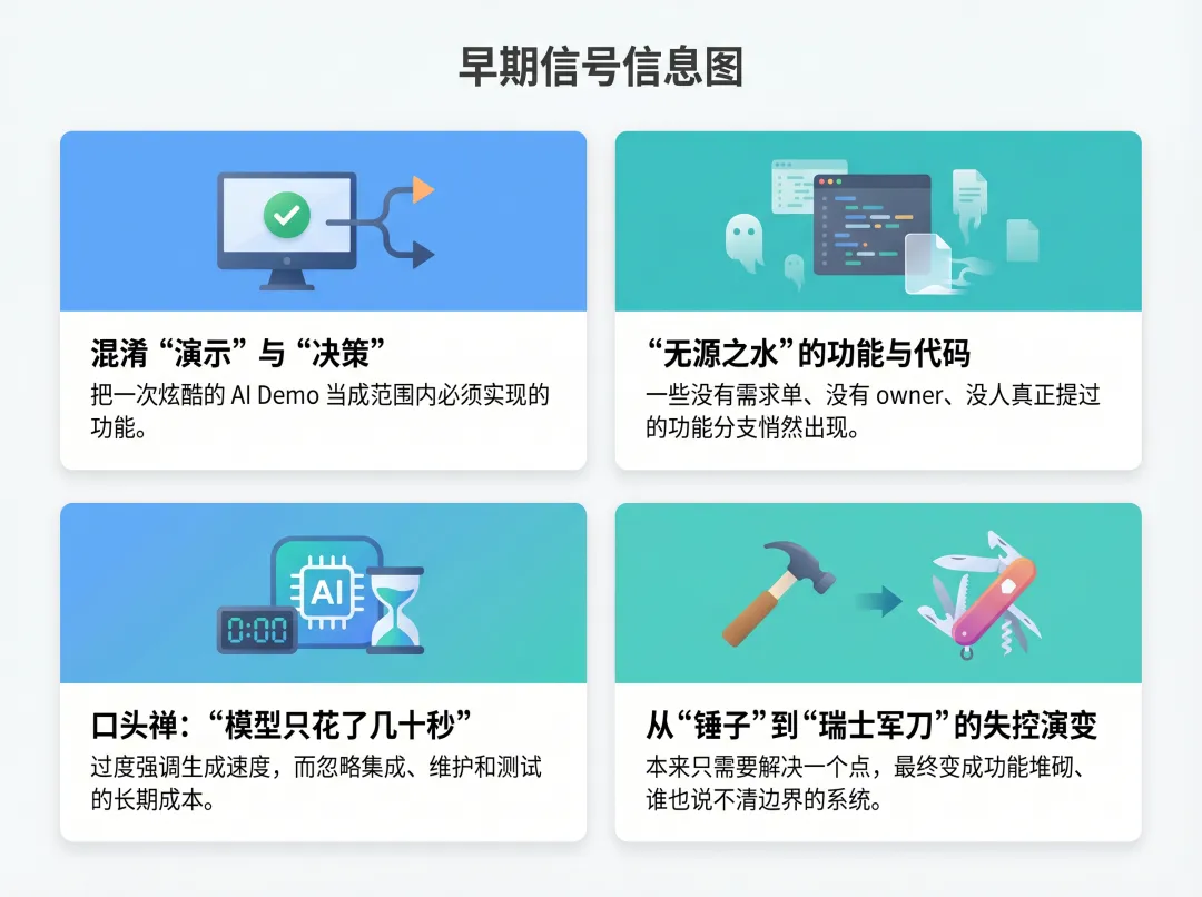 这是最典型也是最危险的信号。当会议中的设计讨论被一个即时生成的代码演示所取代时,团队实际上已经将“技术上的可能性”等同于“产品上的必要性”。AI 让“证明某个想法可行”的成本变得极低,但这并不意味着这个想法就应该被纳入项目范围。