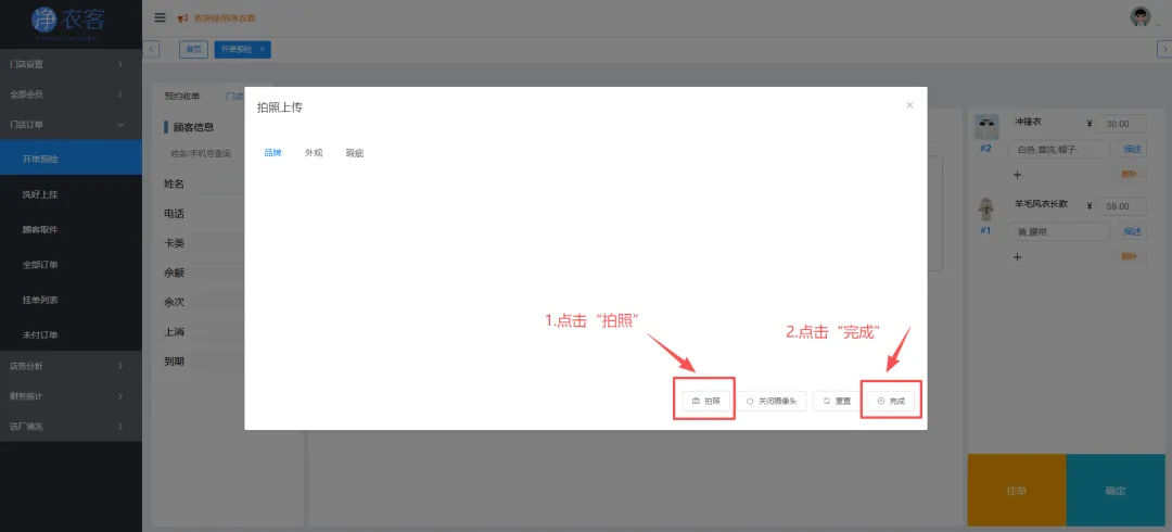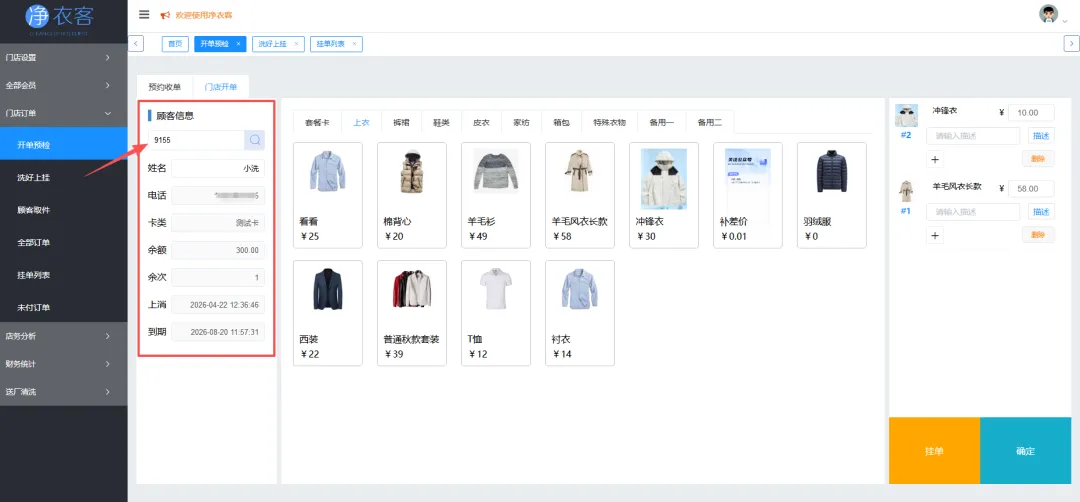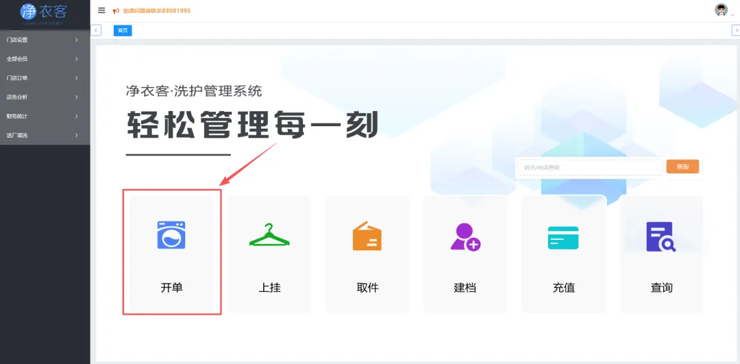 ↑ 进入净衣客首页,点击左边菜单「开单」,进入开单界面。