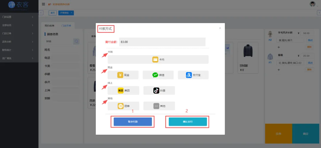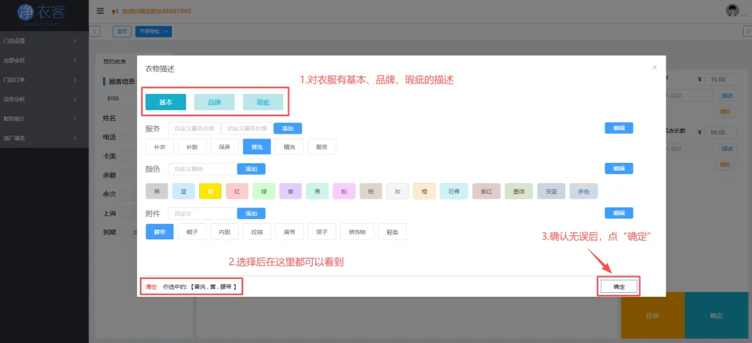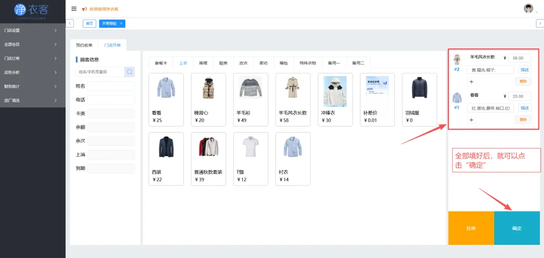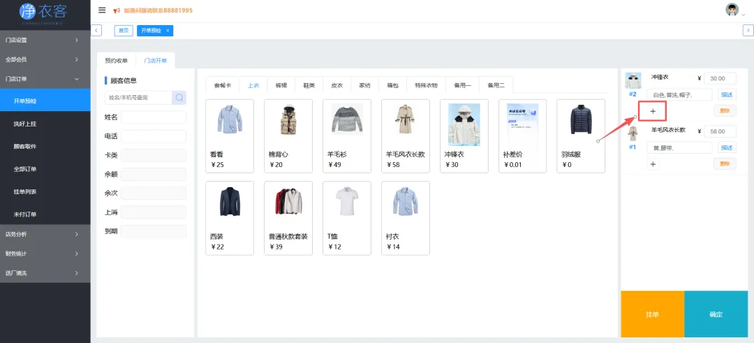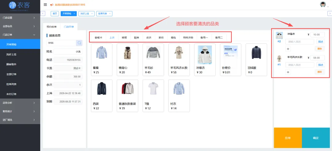 ↑ 进入上面的菜单栏,选择顾客要清洗的品类,在右侧就可以看到所选品类。