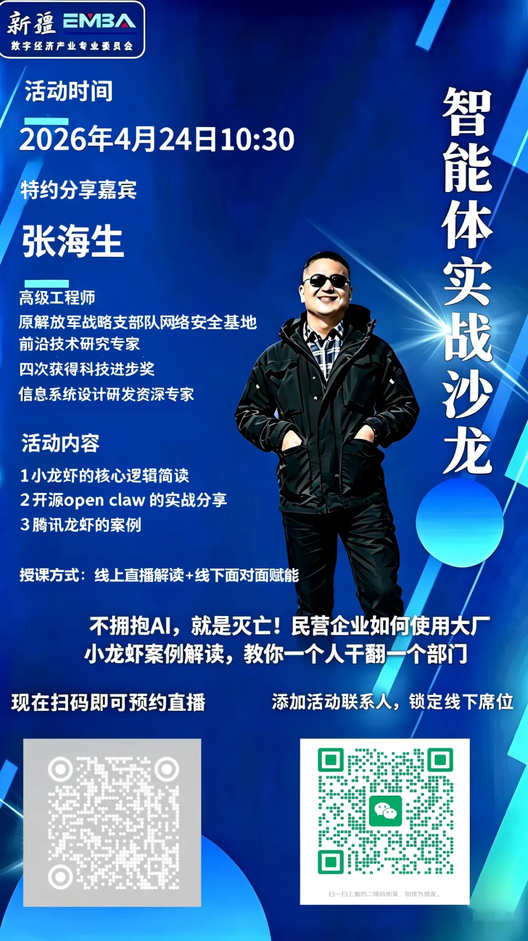 【直播预告】民营企业如何用AI“一个人干翻一个部门”? 活动时间 2026年4月24日(周五)10:30 特邀嘉宾 张海生 高级工程师 解放军战略支援部队网络安全基地前沿技术研究专家 四次获得科技进步奖 信息系统设计研发资深专家 活动亮点 小龙虾的核心逻辑简读:揭秘AI智能体背后的底层逻辑 开源open claw实战分享:手把手教你用开源工具搭建自己的智能体 腾讯龙虾案例深度解读:看大厂如何用AI重构业务流程 为什么你不能错过这场直播? AI不是未来,而是现在! 民营企业如何用AI实现“降本增效”? 一个人如何通过智能体工具,完成一个部门的工作量? 开源工具+大厂案例,教你快速上手,抢占AI红利! 智能体实战沙龙 用AI重构效率,用技术赢得未来! 立即预约,锁定席位! 扫码预约直播,获取回放链接 添加活动联系人,获取专属席位+资料包