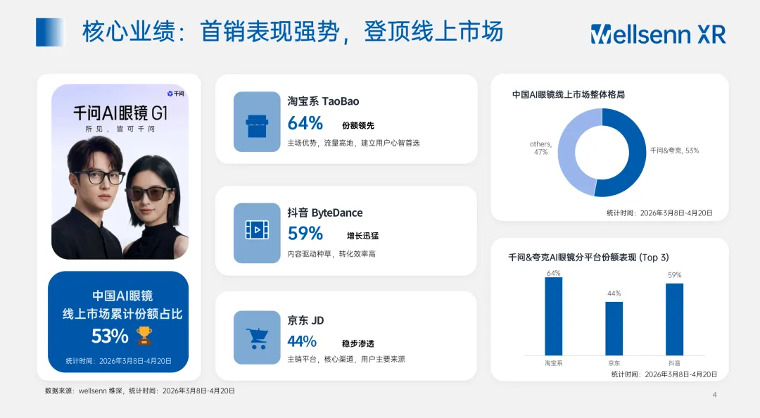 4月22日消息,维深Wellsenn XR最新数据显示,自3月8日正式开售至4月20日,千问AI眼镜线上累计销量占国内AI眼镜市场总份额达53%,稳居线上市场第一。